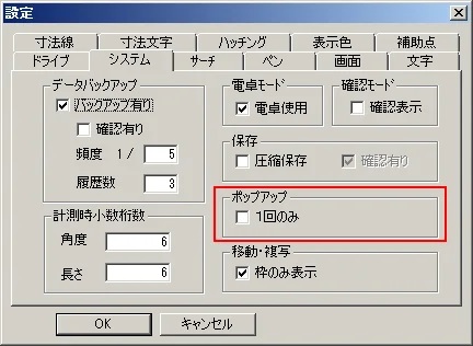 システムタブの右下のポップアップの欄の1回のみというところにチェックを入れると、ポップアップで選んだコマンドを1度使用すると、ポップアップ前のコマンドに戻ります。